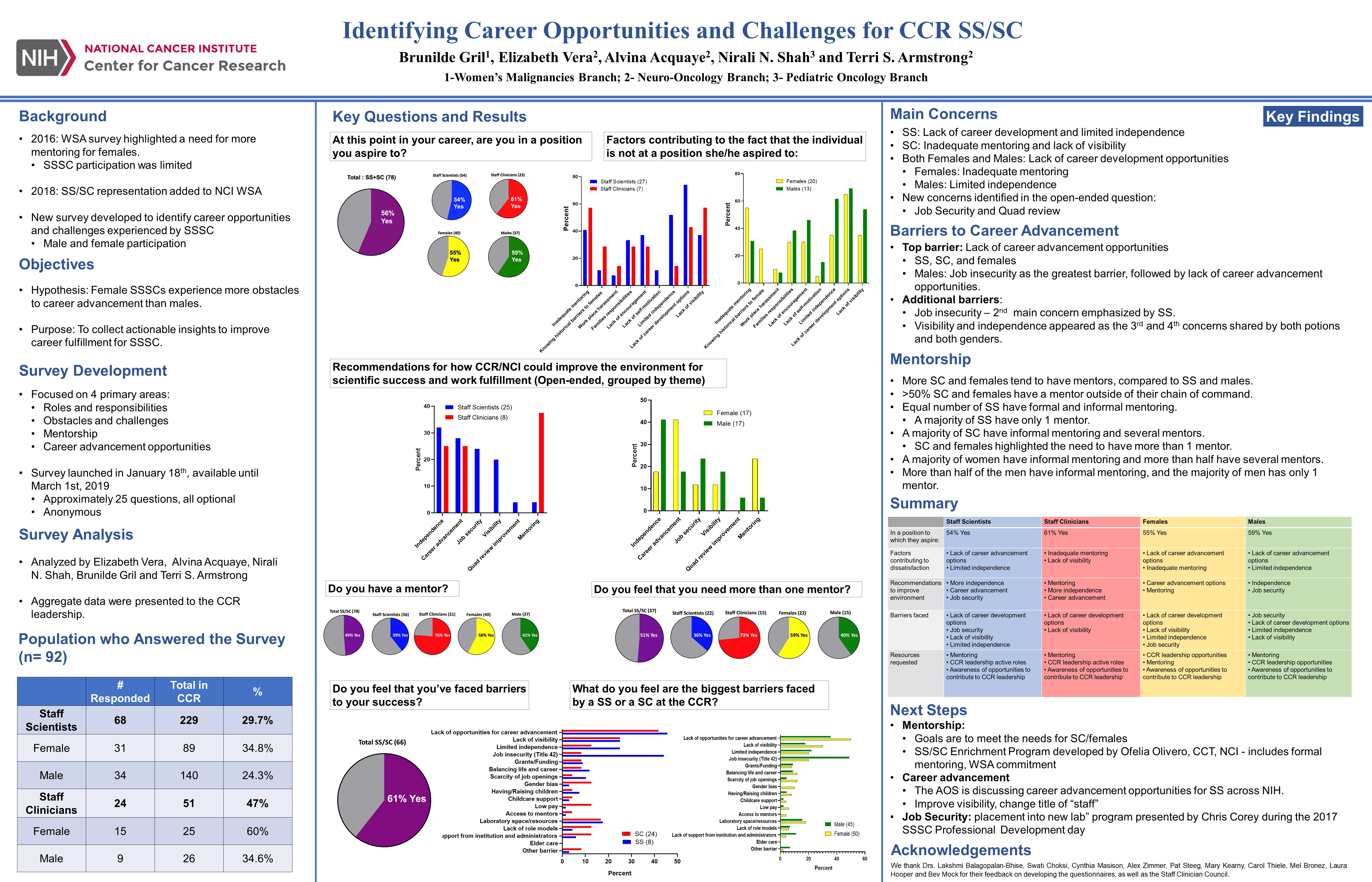 - In 2019, the CCR Women Scientist Advisors (WSAs) conducted a survey (*) to identify career opportunities and challenges experienced by the SS/SC community such as: lack of career advancement opportunities, limited independence, lack of visibility, and defective mentoring. A second discussion with Dr. Misteli was organized by three SSs, Drs. Lakshmi Balagopalan, Swati Choksi and Brunilde Gril, to bring awareness of these challenges and needs to CCR leadership. By his presence and comments, Dr. Misteli sent a clear message: the career fulfillment and job satisfaction of SS/SCs are a priority.