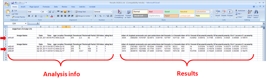 Both the analysis settings and the computed parameters are written in separated blocks to the indicated Excel file. The recorded analysis settings include the date and time of the analysis, the location of the test image, and the user selected values for the controls in the Analysis tab and the calibration information in the Setting tab. Data generated in separate AngioTool sessions but written to the same Excel file are appended at the end of the file each with bold headings (red arrows).